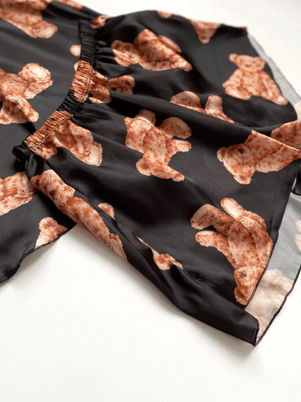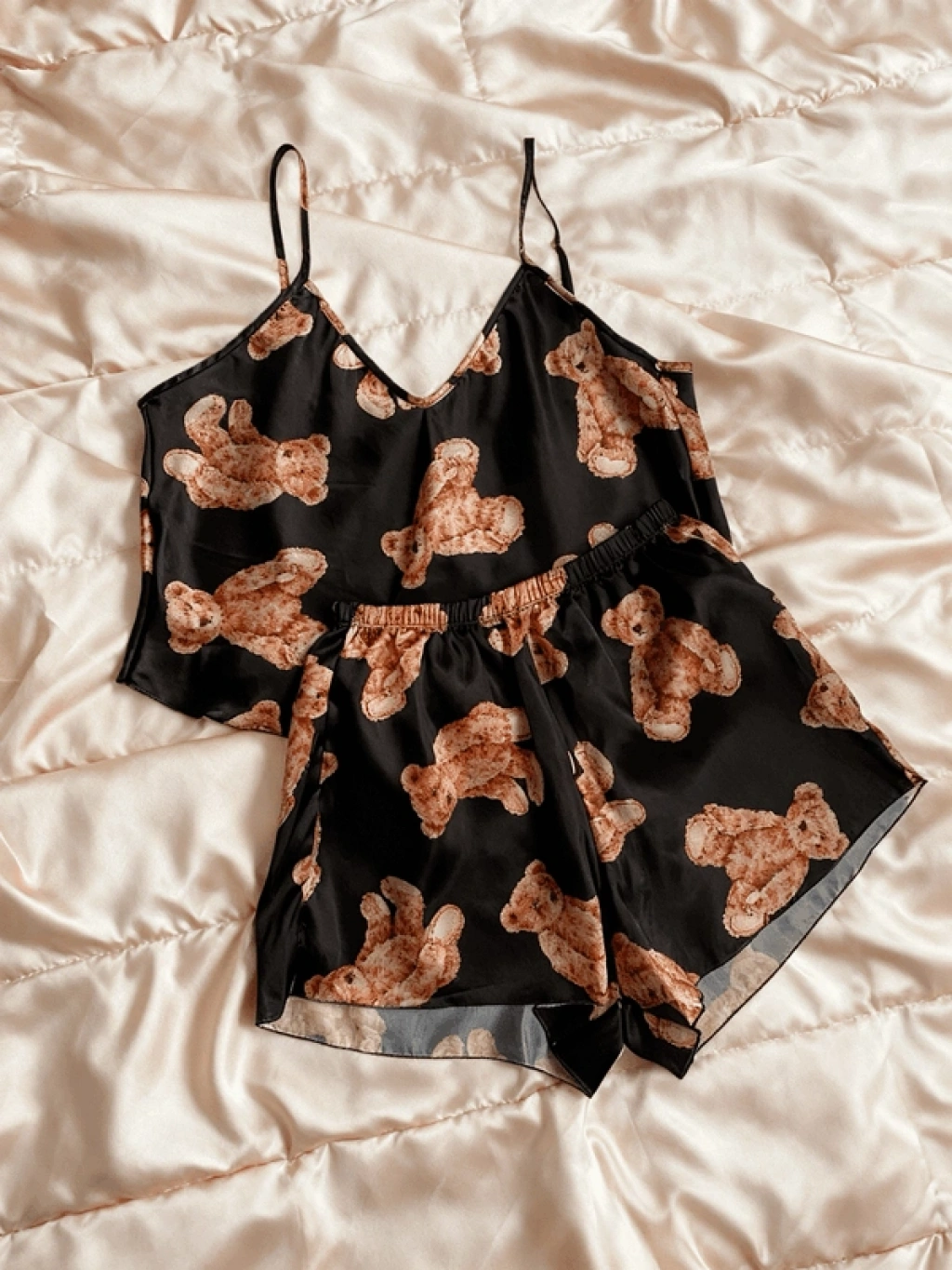 Ayı Baskılı Askılı Saten Şortlu Takım