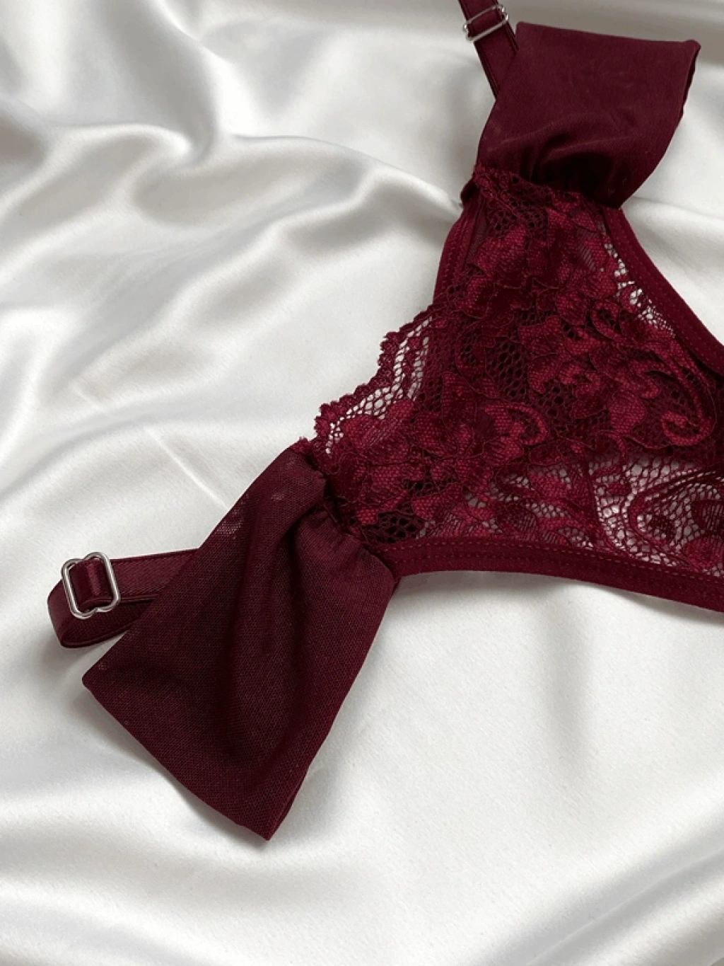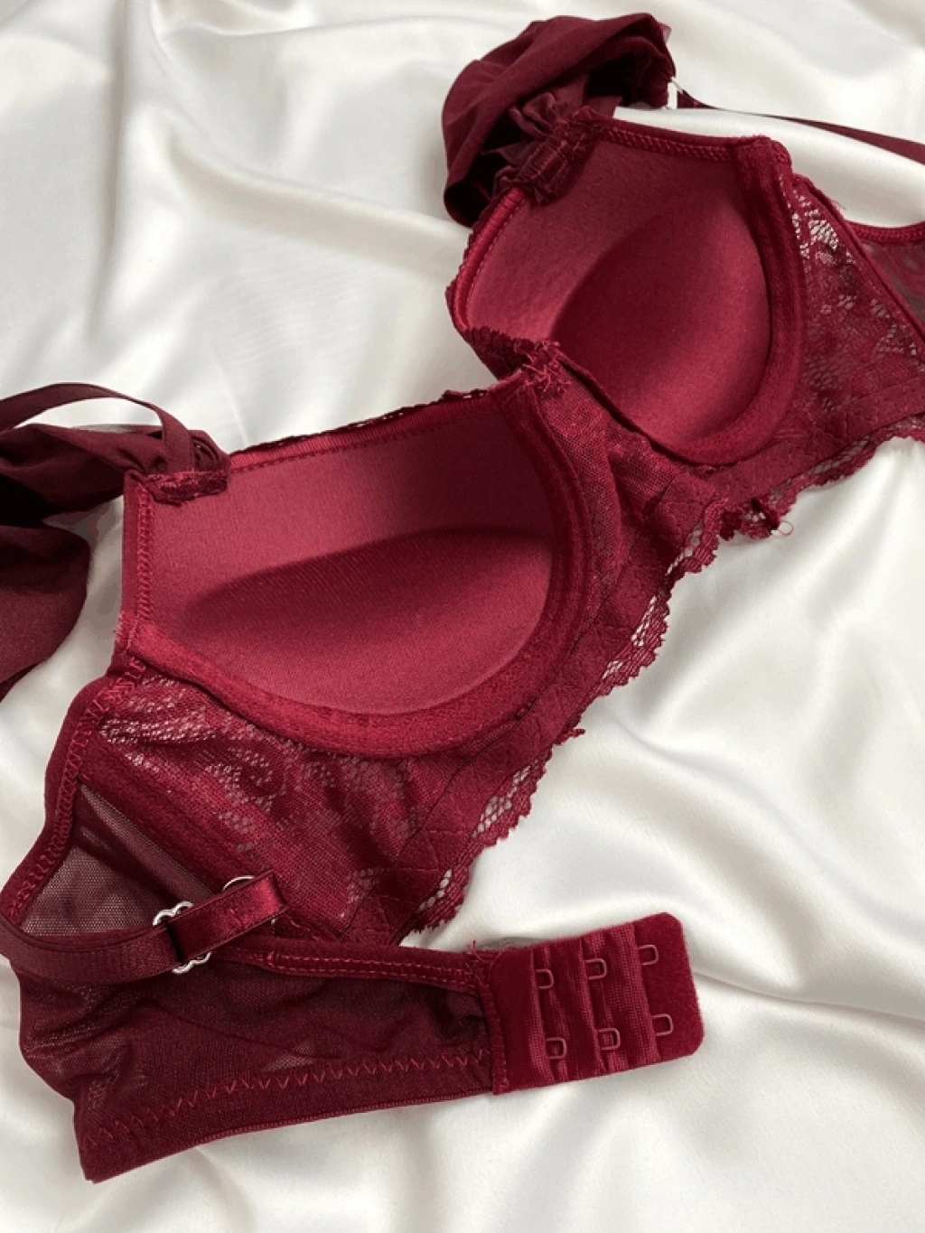 Bordo Kol Tül Detaylı Dantelli Destekli Sütyen Takım