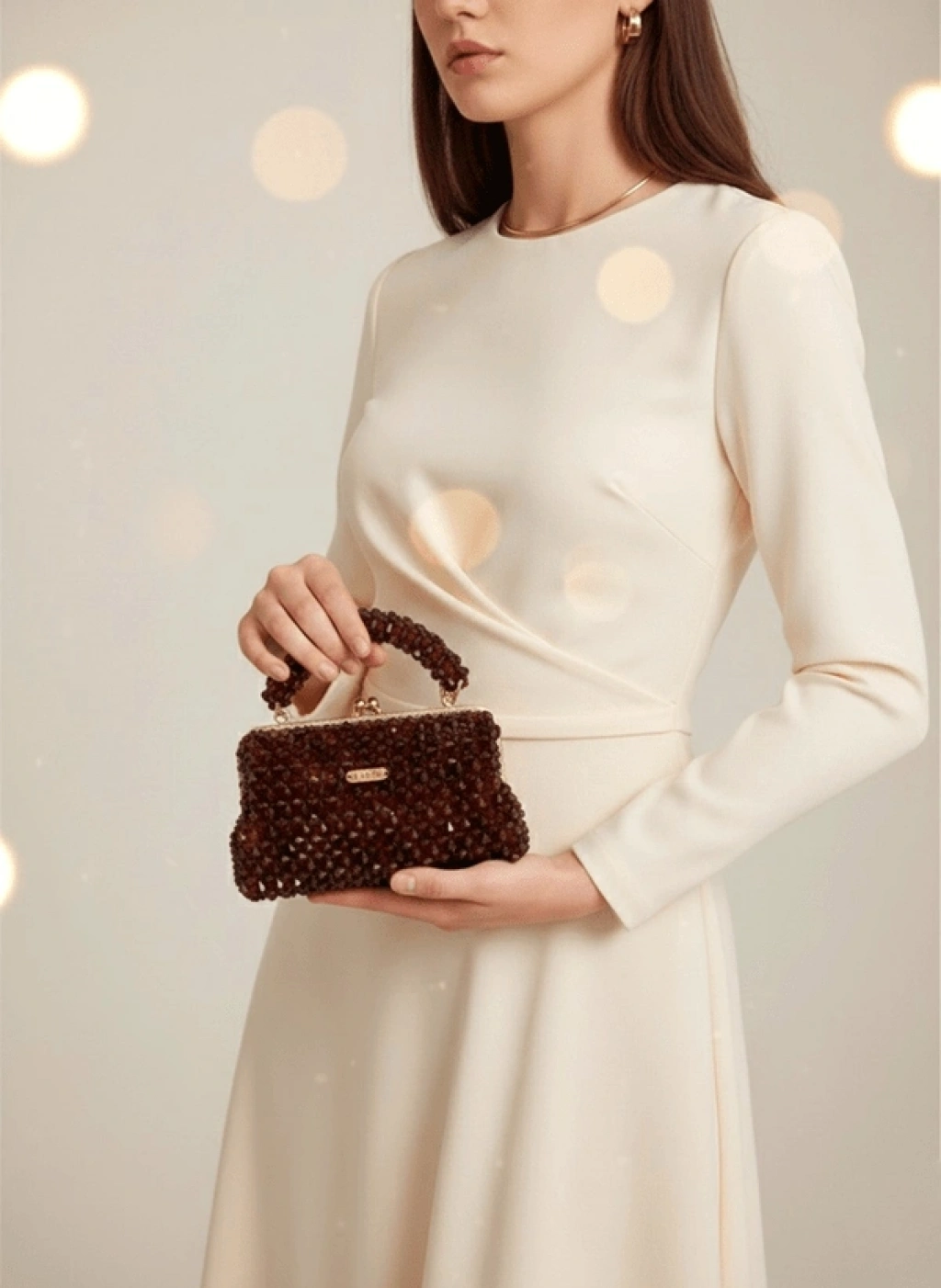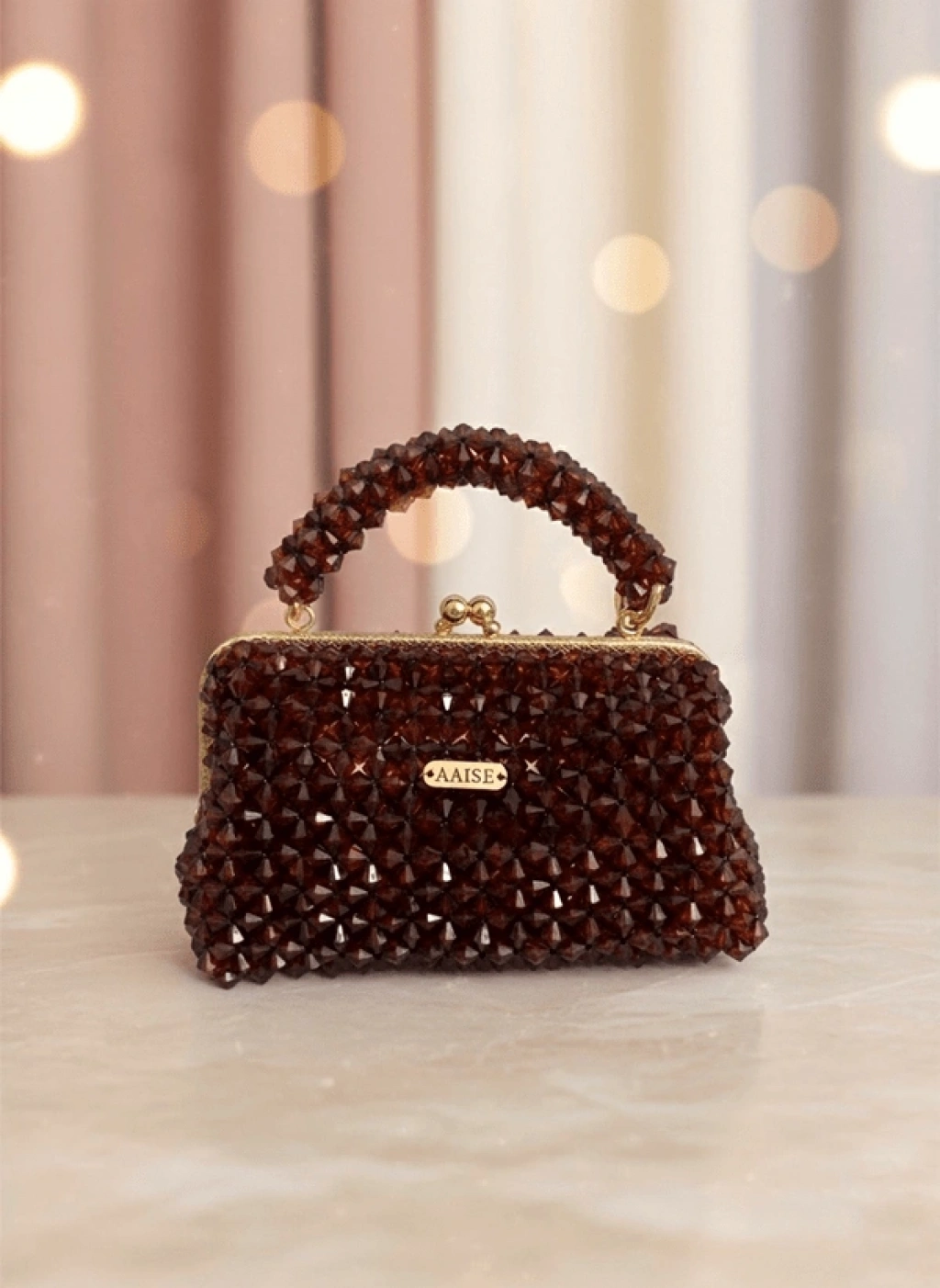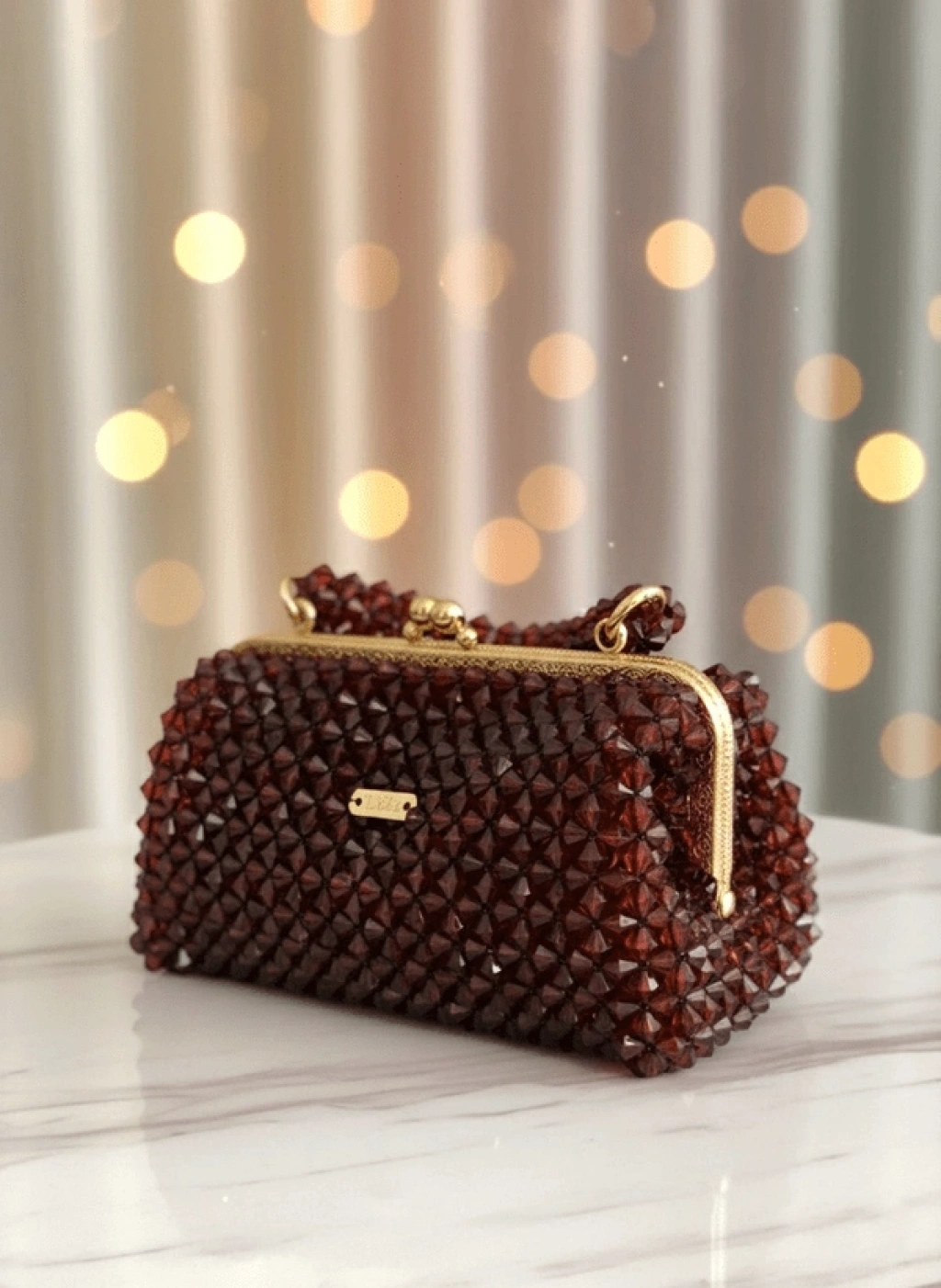 Her biri özenle dizilmiş koyu kahverengi kristal boncuklardan oluşan bu çanta, vintage altın çerçevesiyle asil bir duruş sergiler.