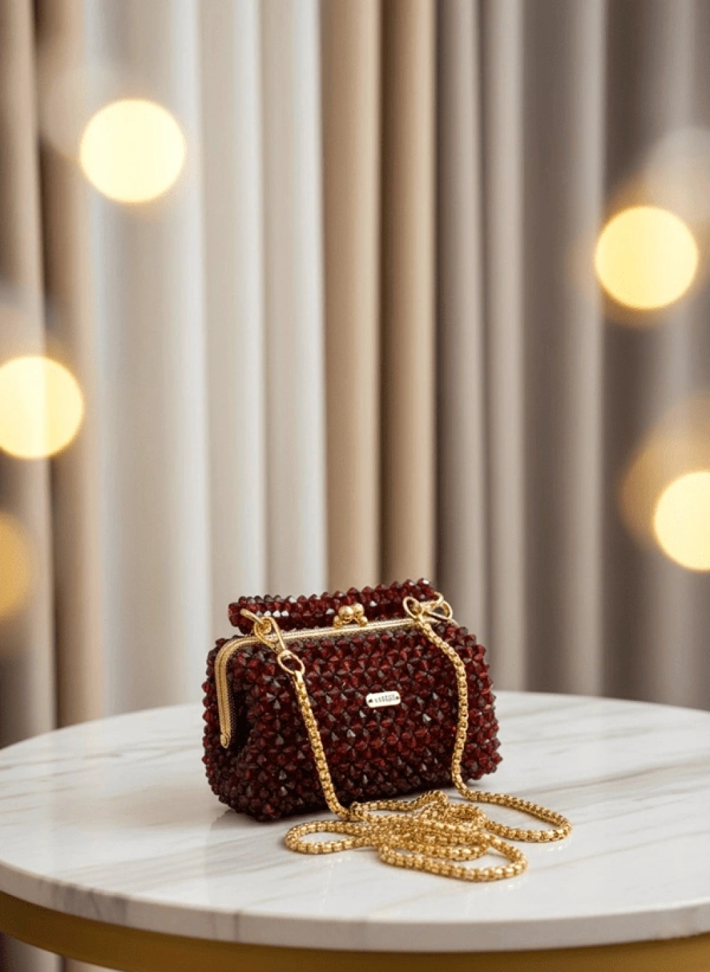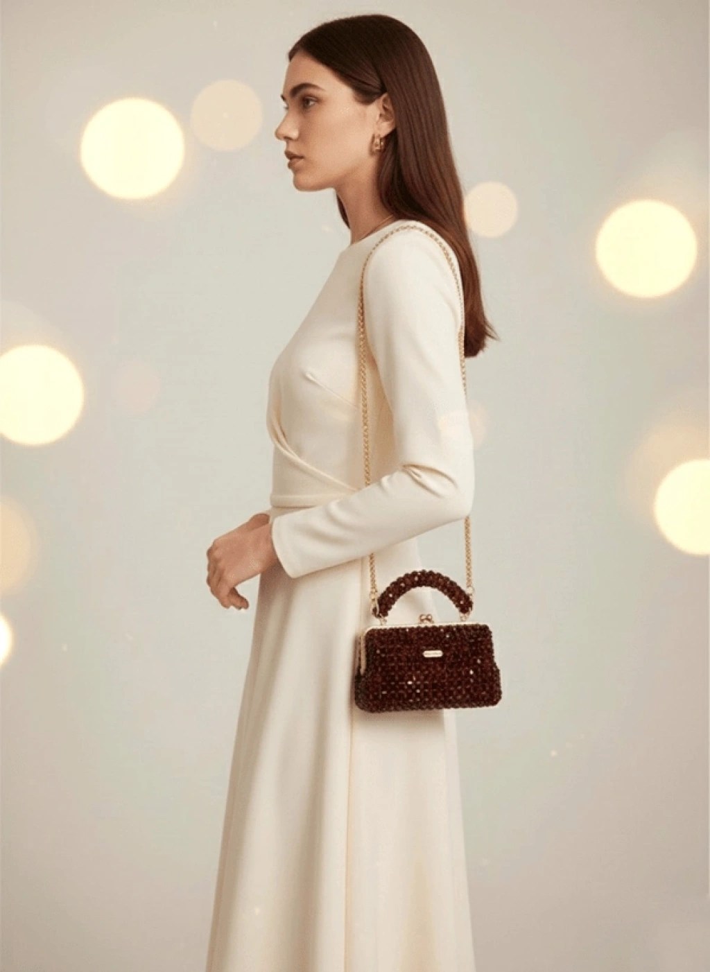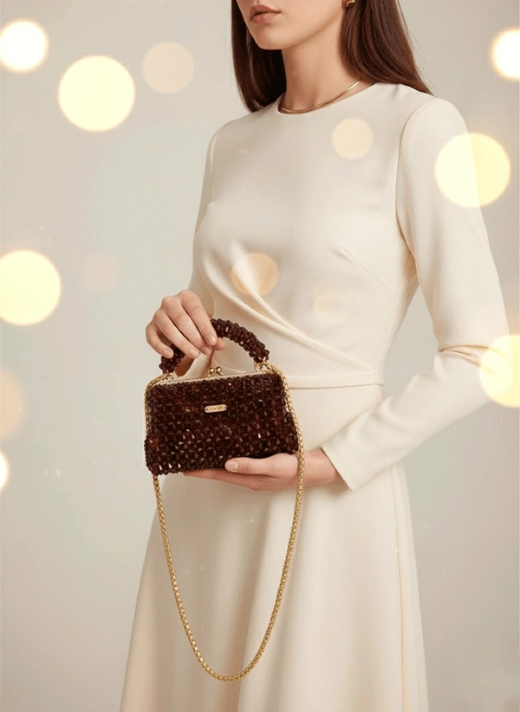 Her biri özenle dizilmiş koyu kahverengi kristal boncuklardan oluşan bu çanta, vintage altın çerçevesiyle asil bir duruş sergiler.