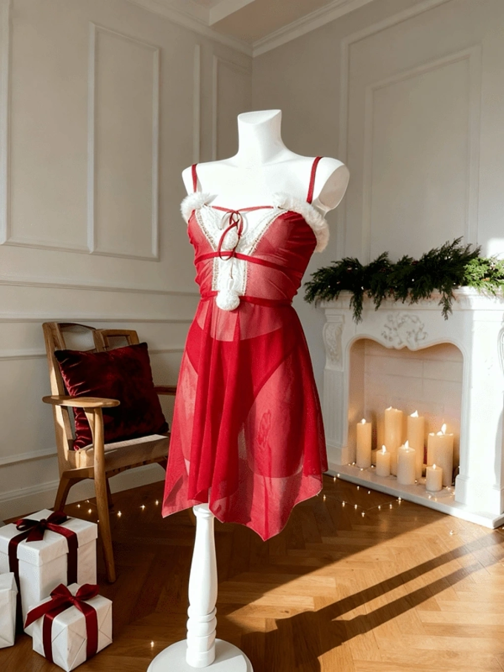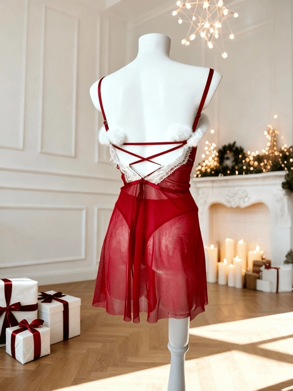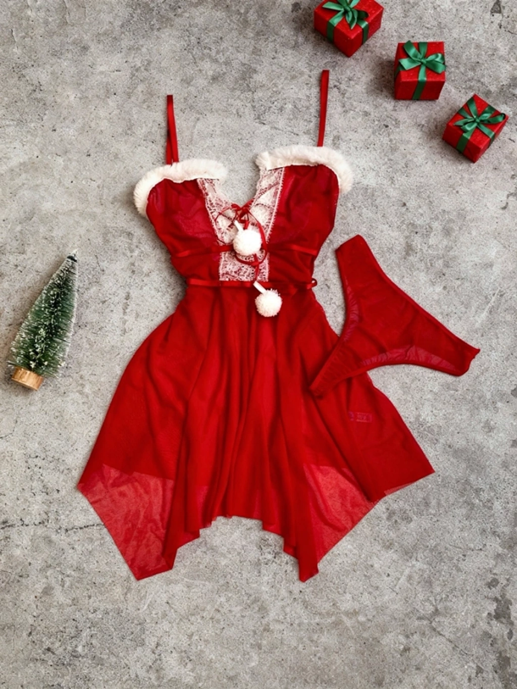 Yılbaşı Özel Ponpon Detaylı Tüylü Gecelik ❤️