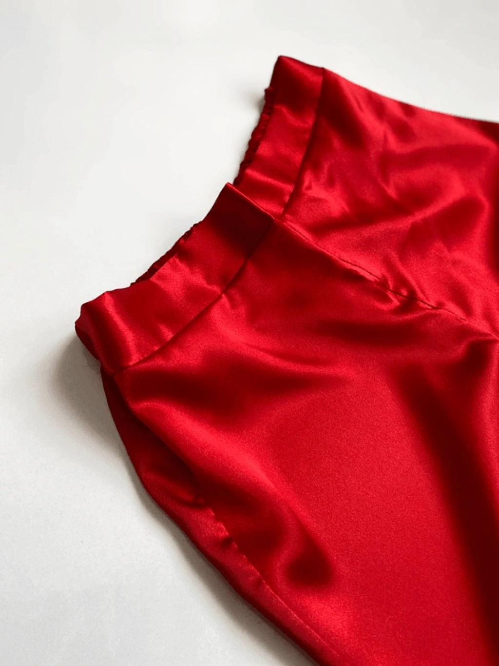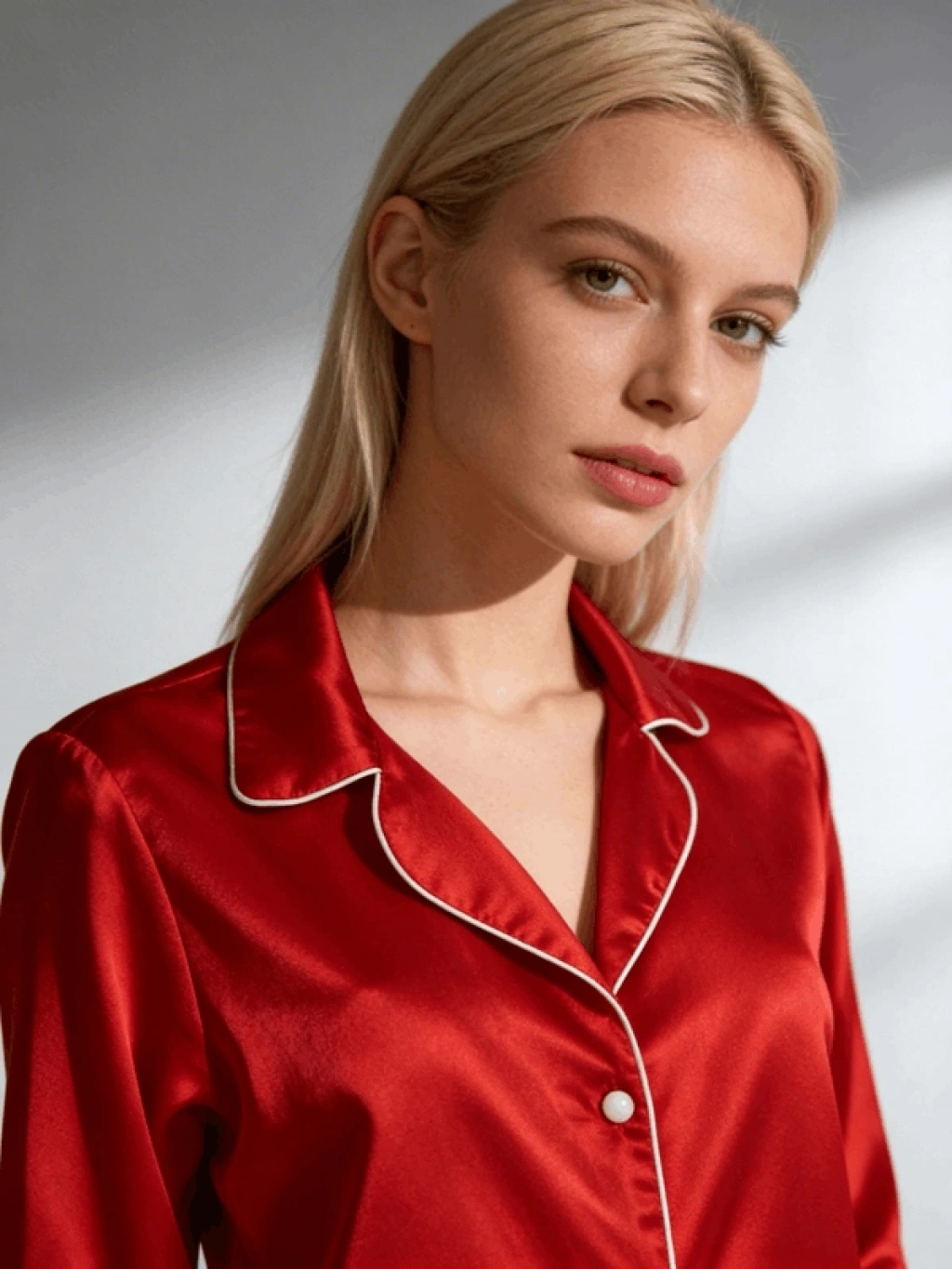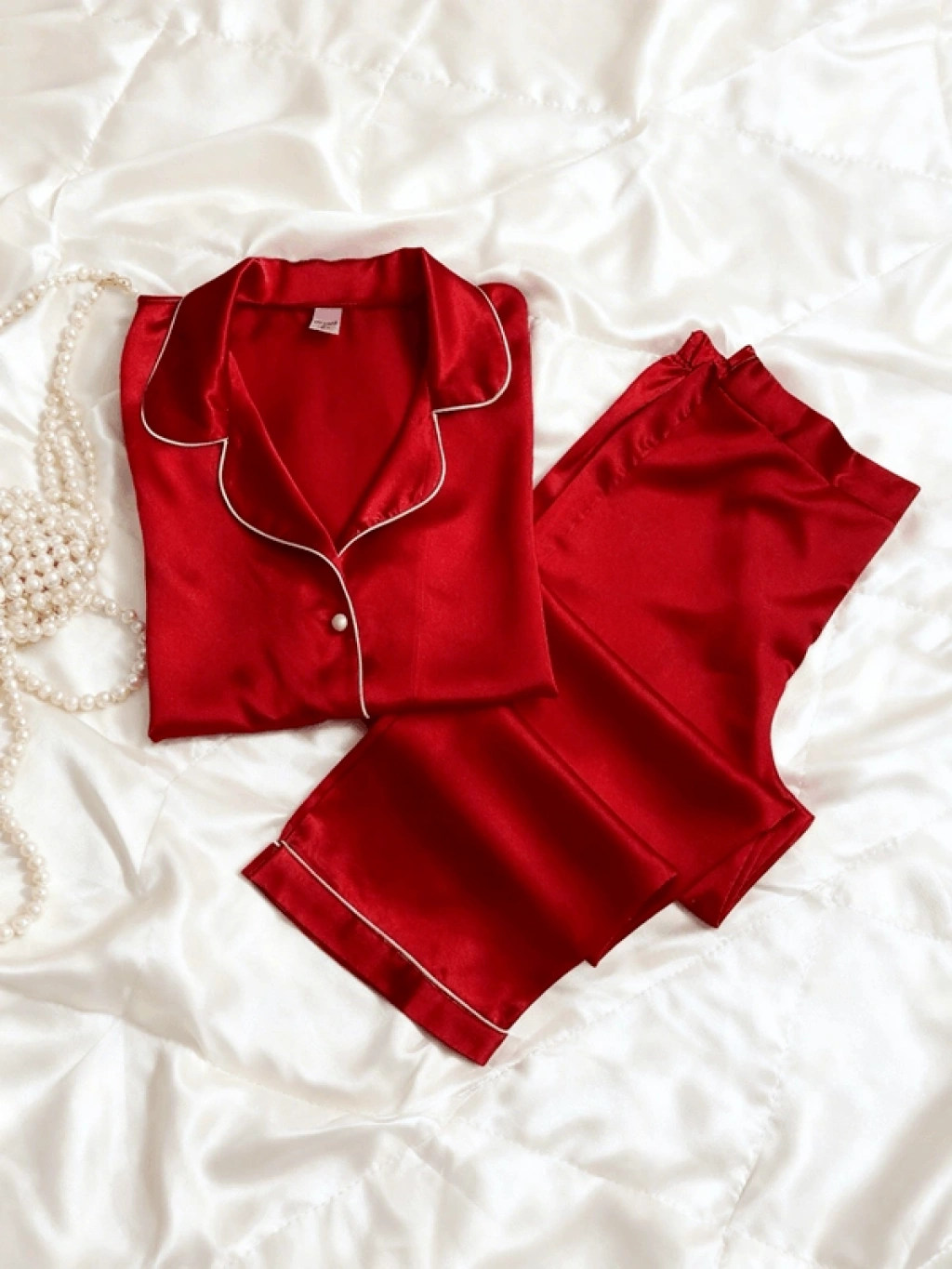 Ev giyiminde kalite ve tarz arayanlar için Kırmızı Biyeli Saten Uzun Kollu Pijama Takımı, vazgeçilmez bir parçadır.