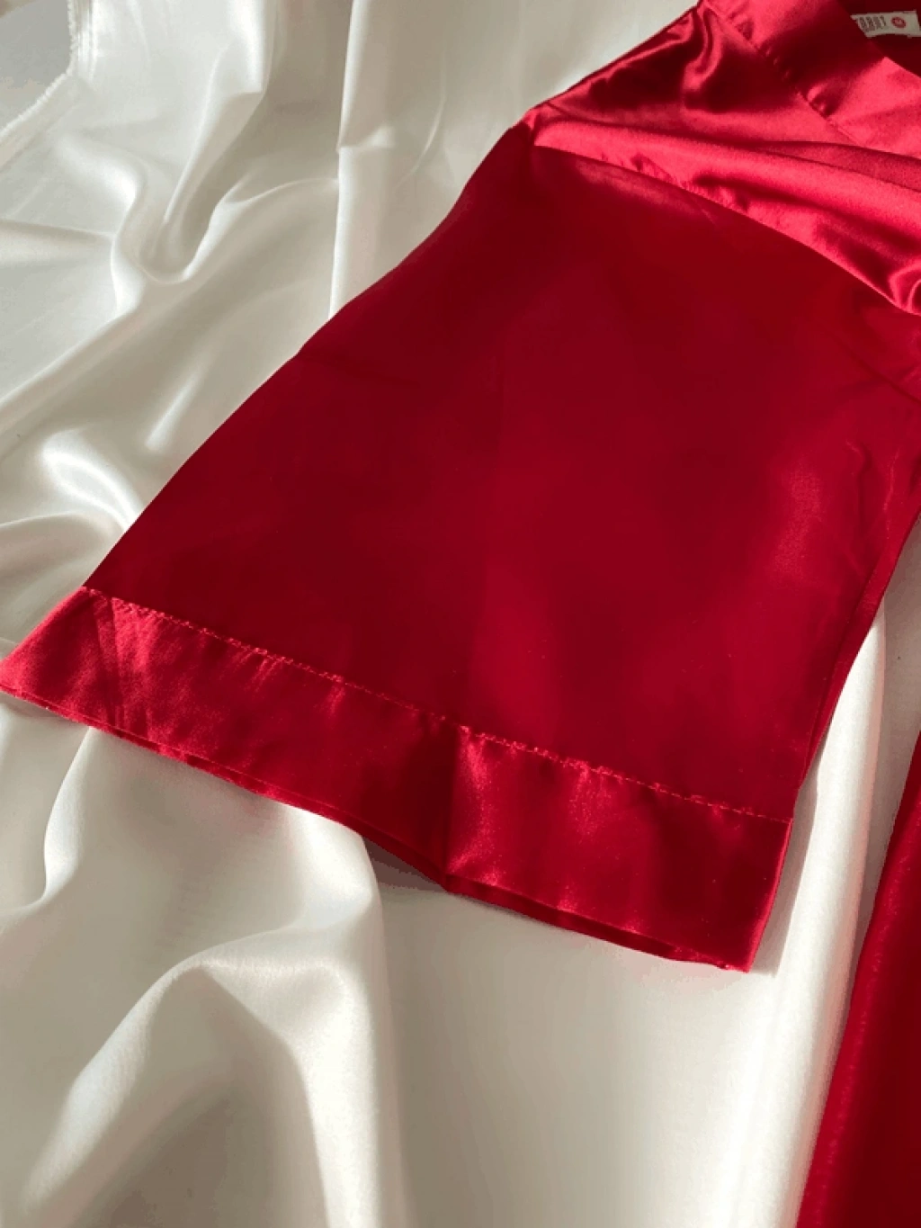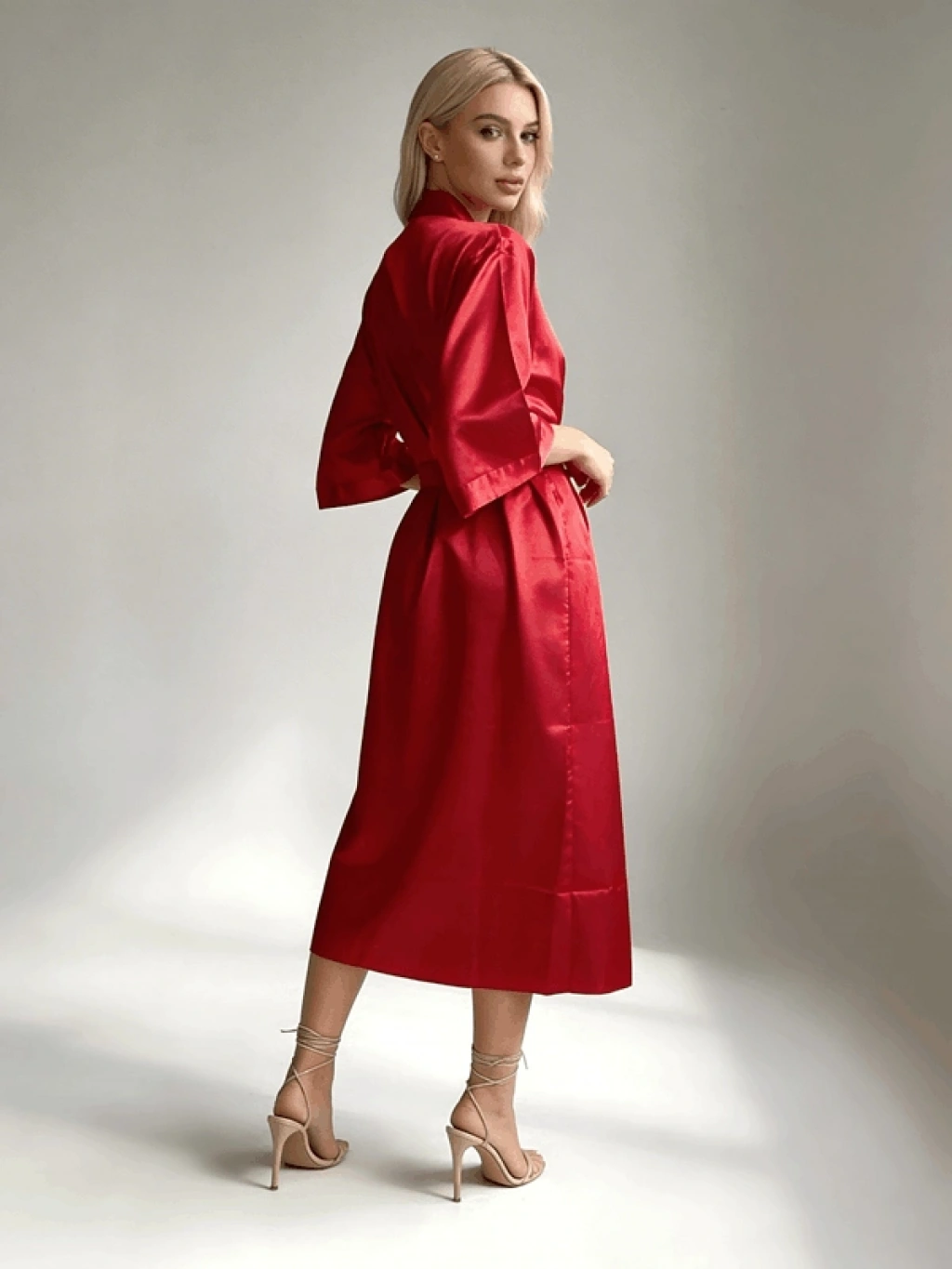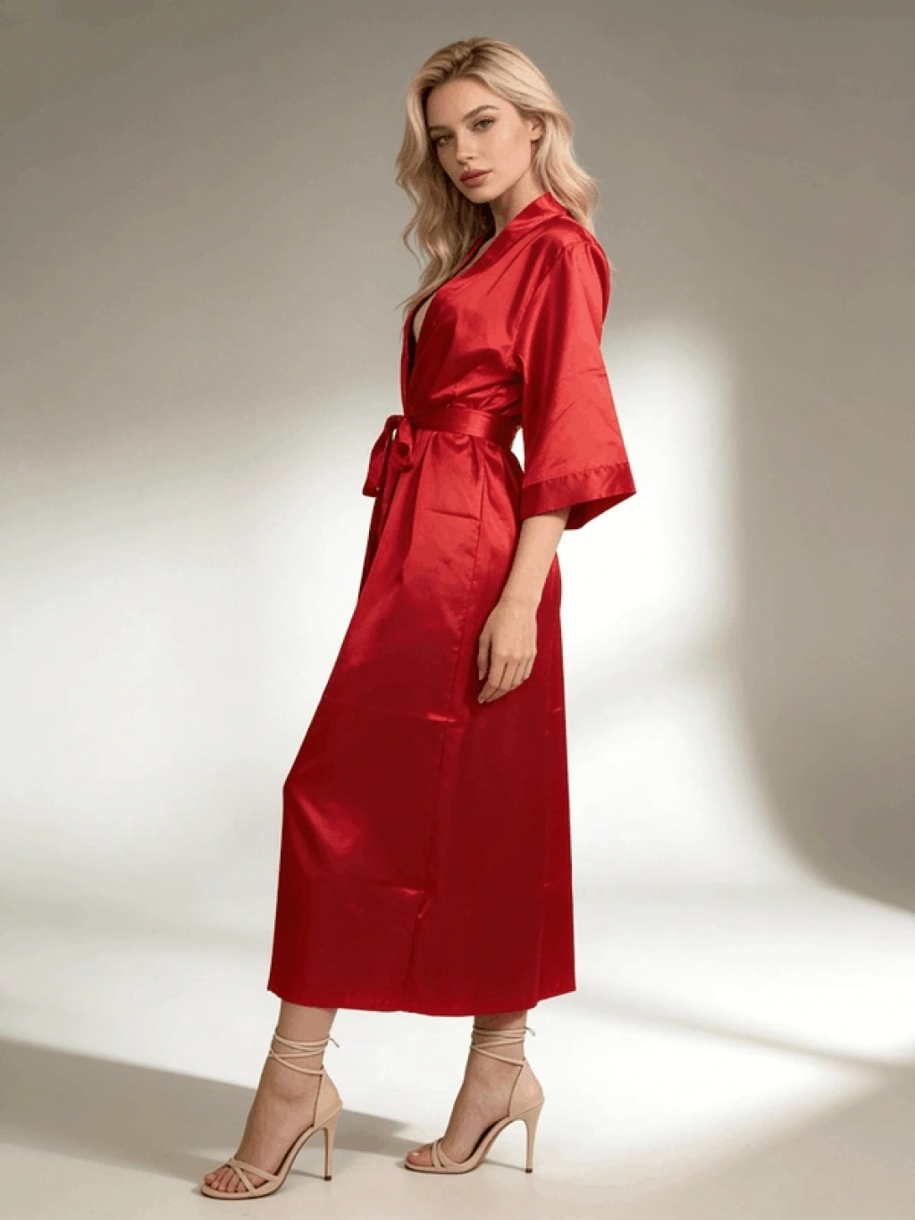 Kırmızı Fakir Kol Uzun Saten Sabahlık