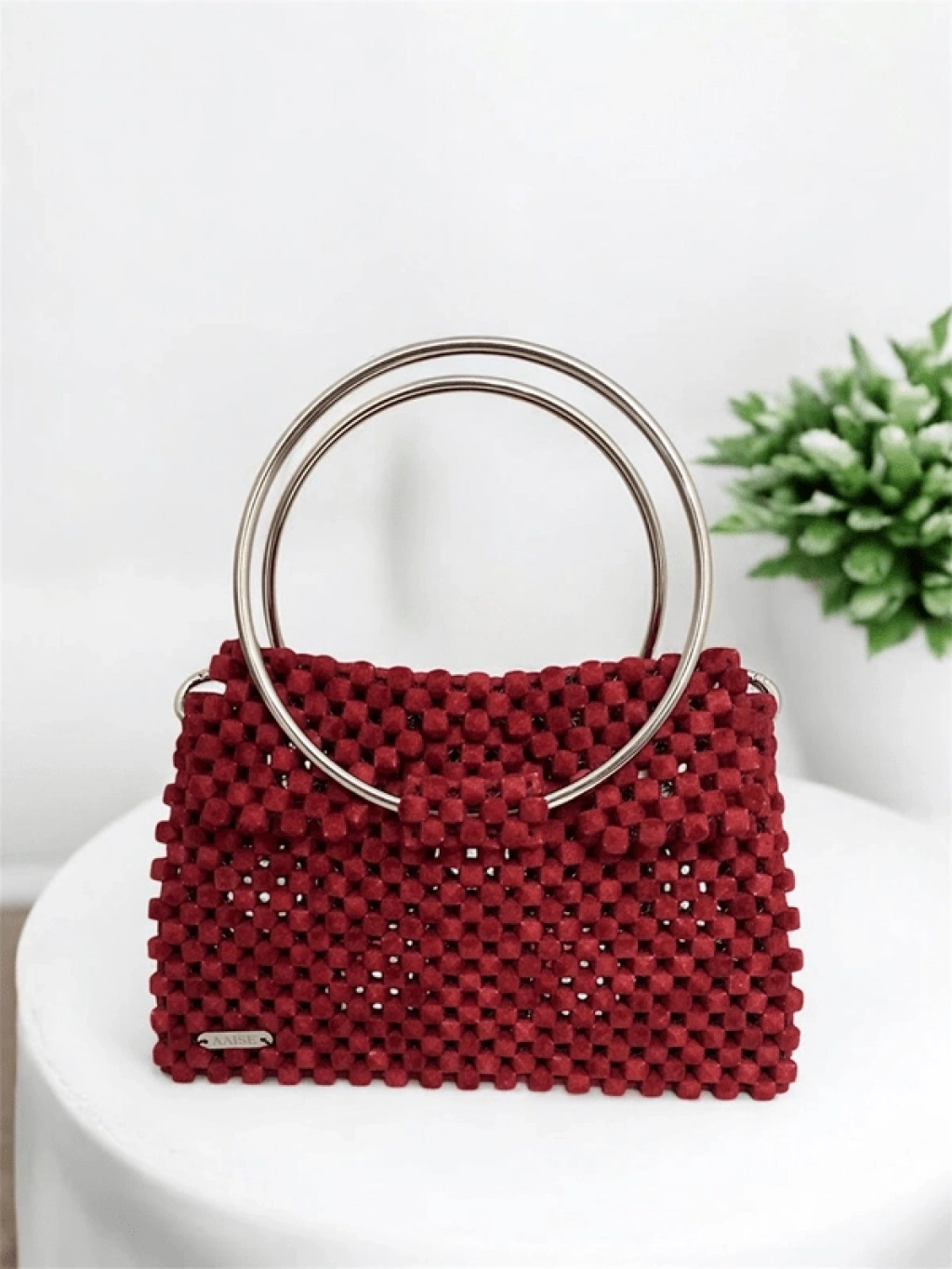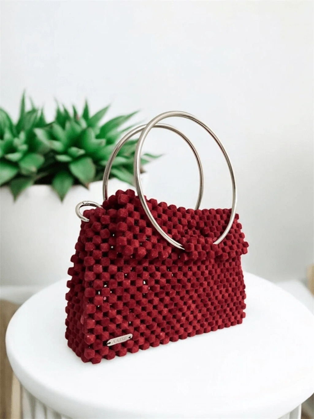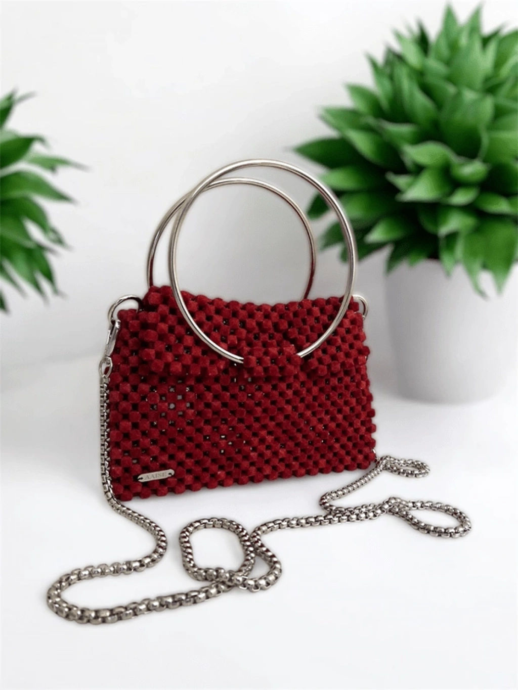 Koyu bordo kadife dokulu boncukların el işçiliğiyle örülmesiyle hazırlanan bu çanta, gümüş renk modern metal sapıyla güçlü bir duruş kazanıyor. Hem gece kombinlerini tamamlayan şık bir parça, hem de günlük stile zarif bir dokunuş…