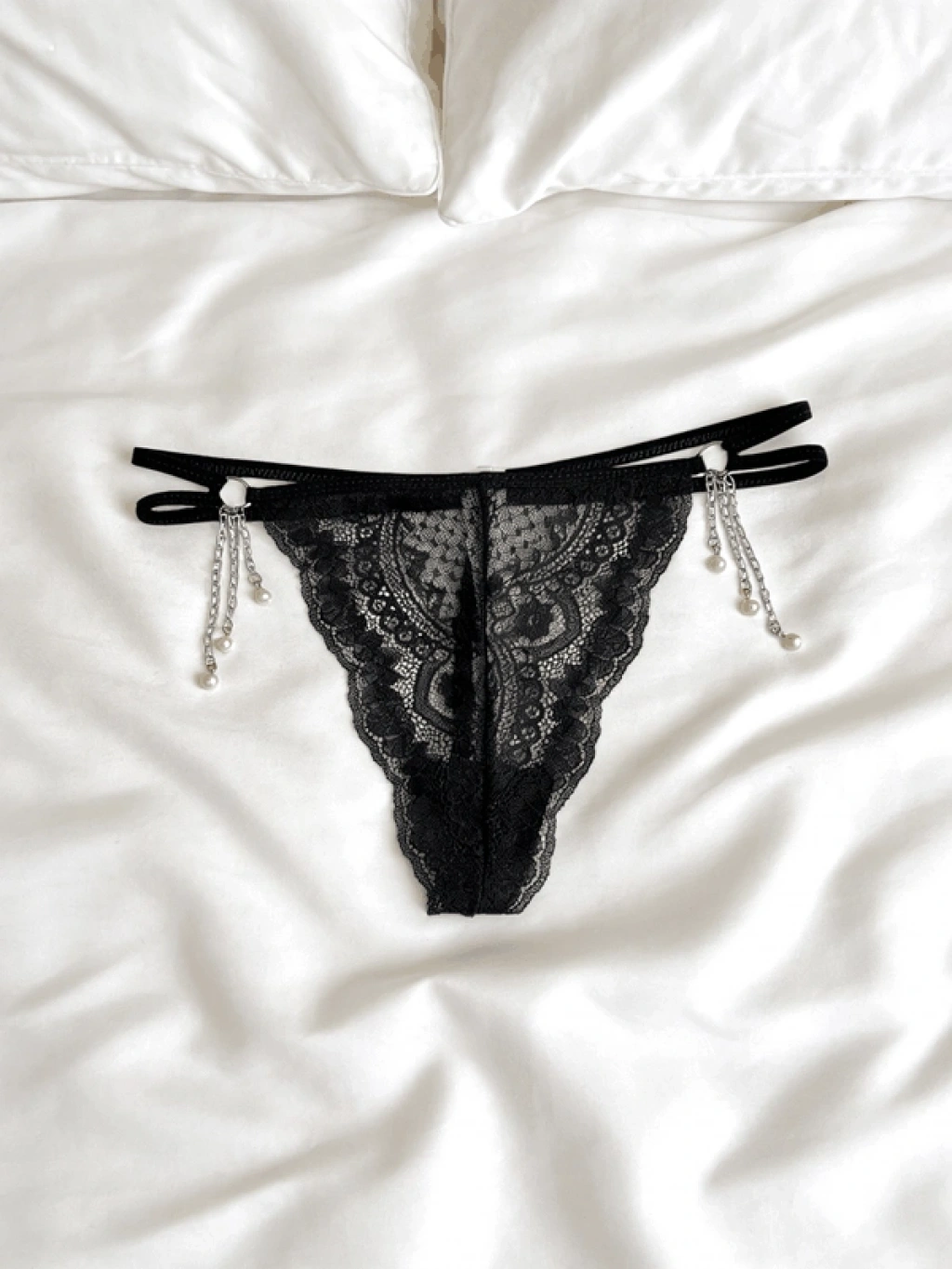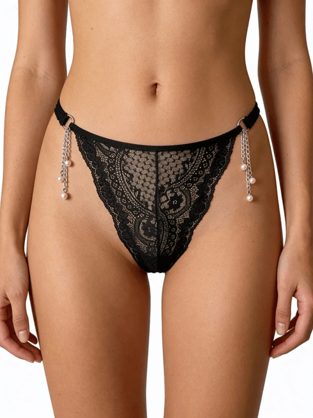 Özel gecelerinizde kendinizi özel hissetmek ve çekici görünmek istiyorsanız, Siyah İnci ve Dantel Detaylı String tam size göre!